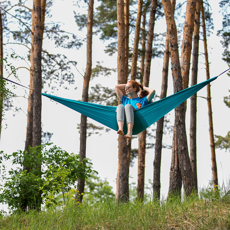 To pełnowymiarowy hamak (300 x 140 cm), który jest równocześnie niezwykle poręczny i można spakować go do niewielkich rozmiarów. Sprawia to, że jest niezastąpionym towarzyszem podróży. Waży zaledwie 425 g, a pokrowiec ma niecałe 20 cm długości.