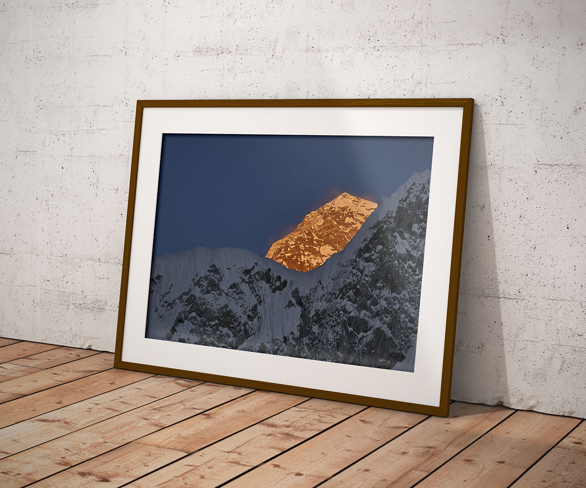 Wierzchołek Everestu o zachodzie słońca. Fotografia wykonana z Gorakshep, podczas wyprawy w Himalaje w roku 2008.