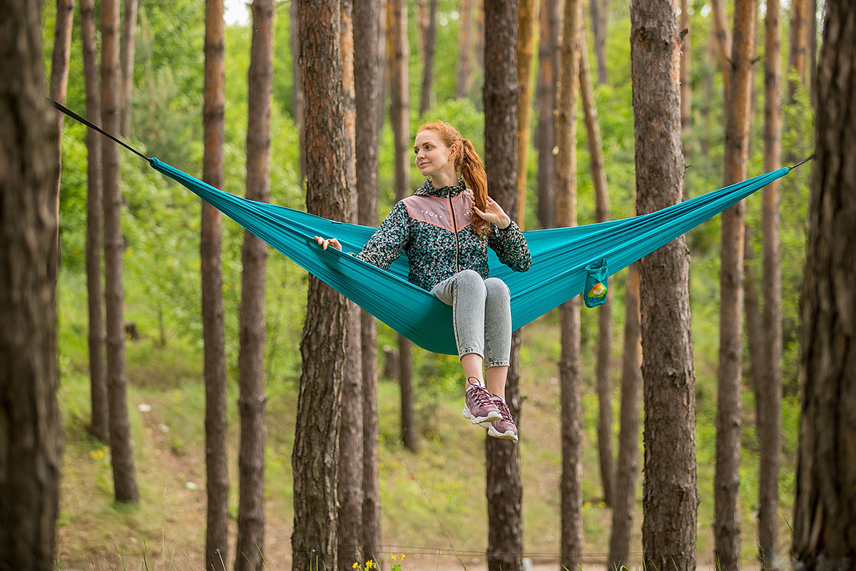 Zintegrowany system z Dyneema i aluminiowym karabińczykiem 7075 zapewnia bezpieczne mocowanie, dzięki czemu możesz zrelaksować się w dobrym stylu. Ponadto, pętla z wysokowytrzymałego poliestru chroni pień drzewa przed uszkodzeniami.